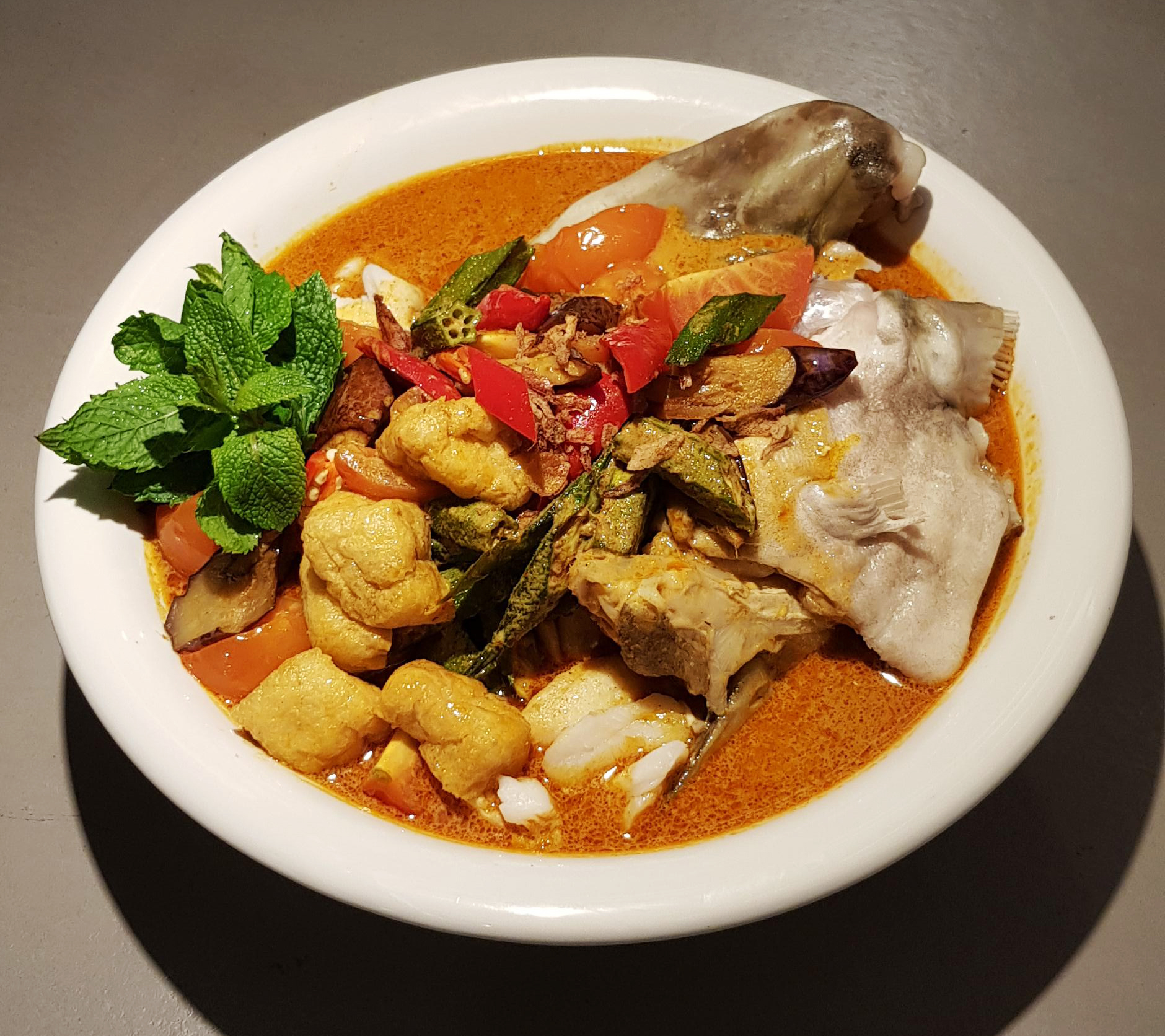 Whole cod fish head & cod cheek, aubergine, tomato, okra, dried bean curd and chilli. Prefect for four to share.