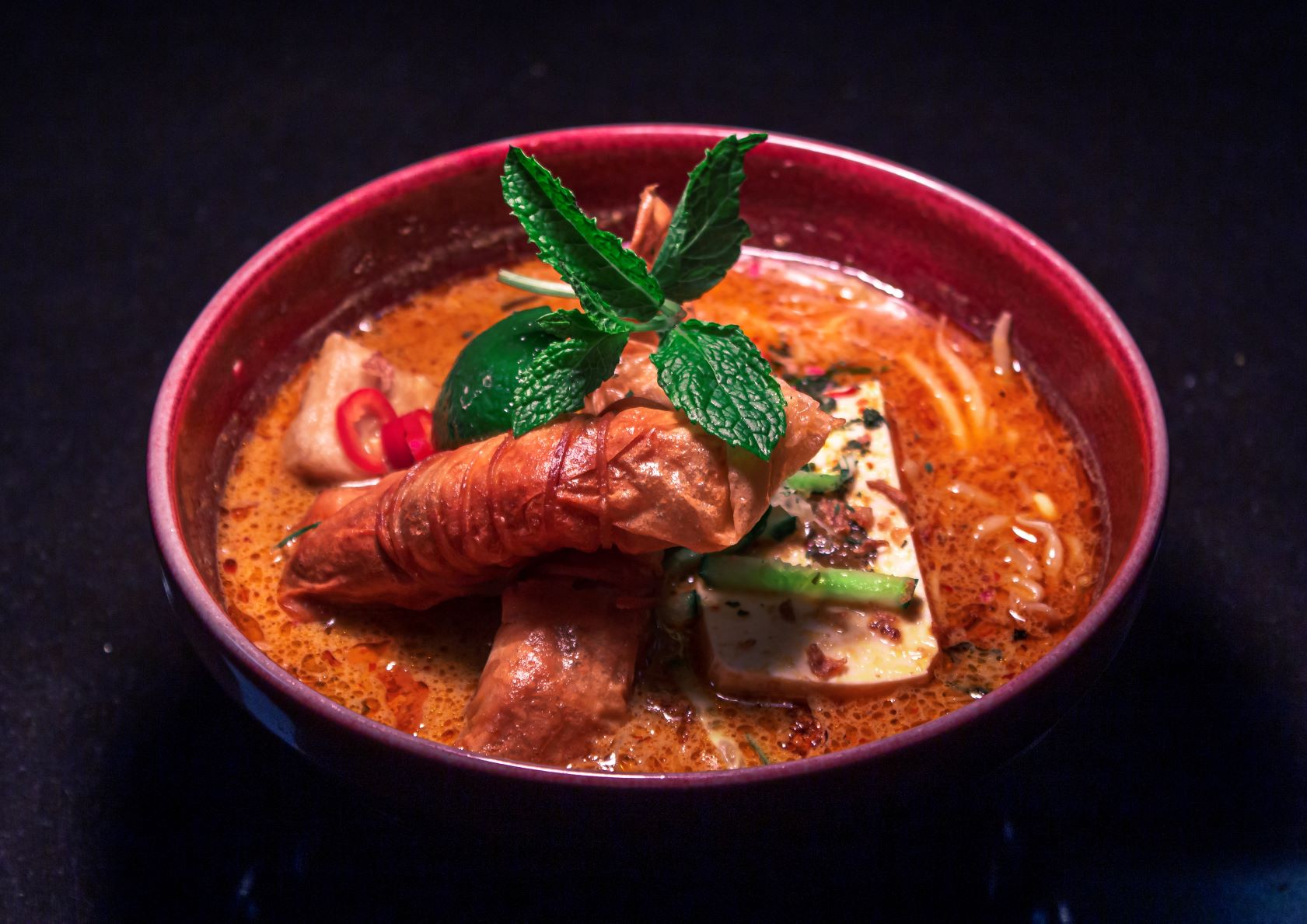 A decadent and rich curry broth loaded with malaysian spices to tease your taste buds. Served with yellow egg noodles and tofu puffs.