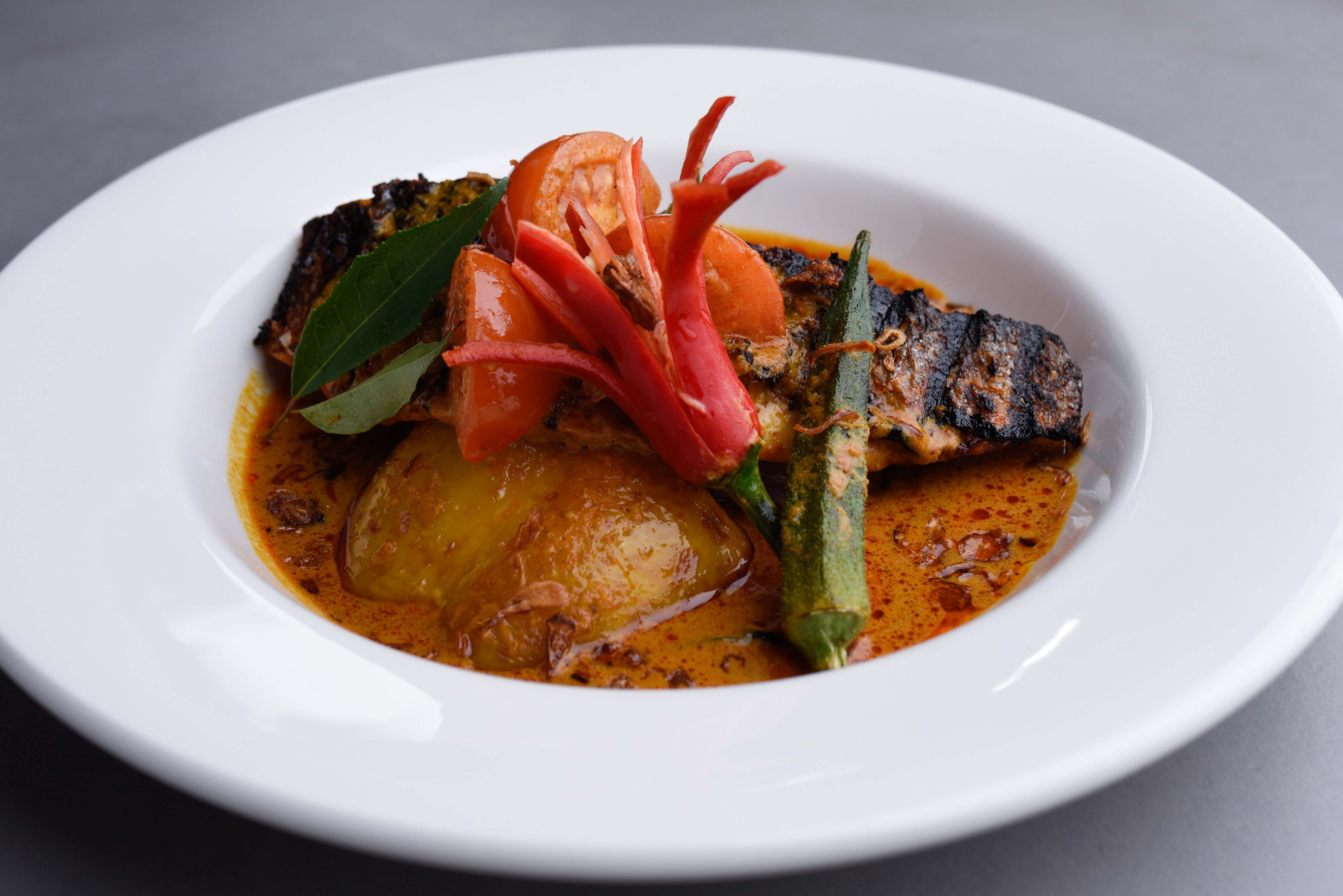 Grilled sea bass topped with sambal sauce, aubergine, tomato, okra and grilled bell pepper.