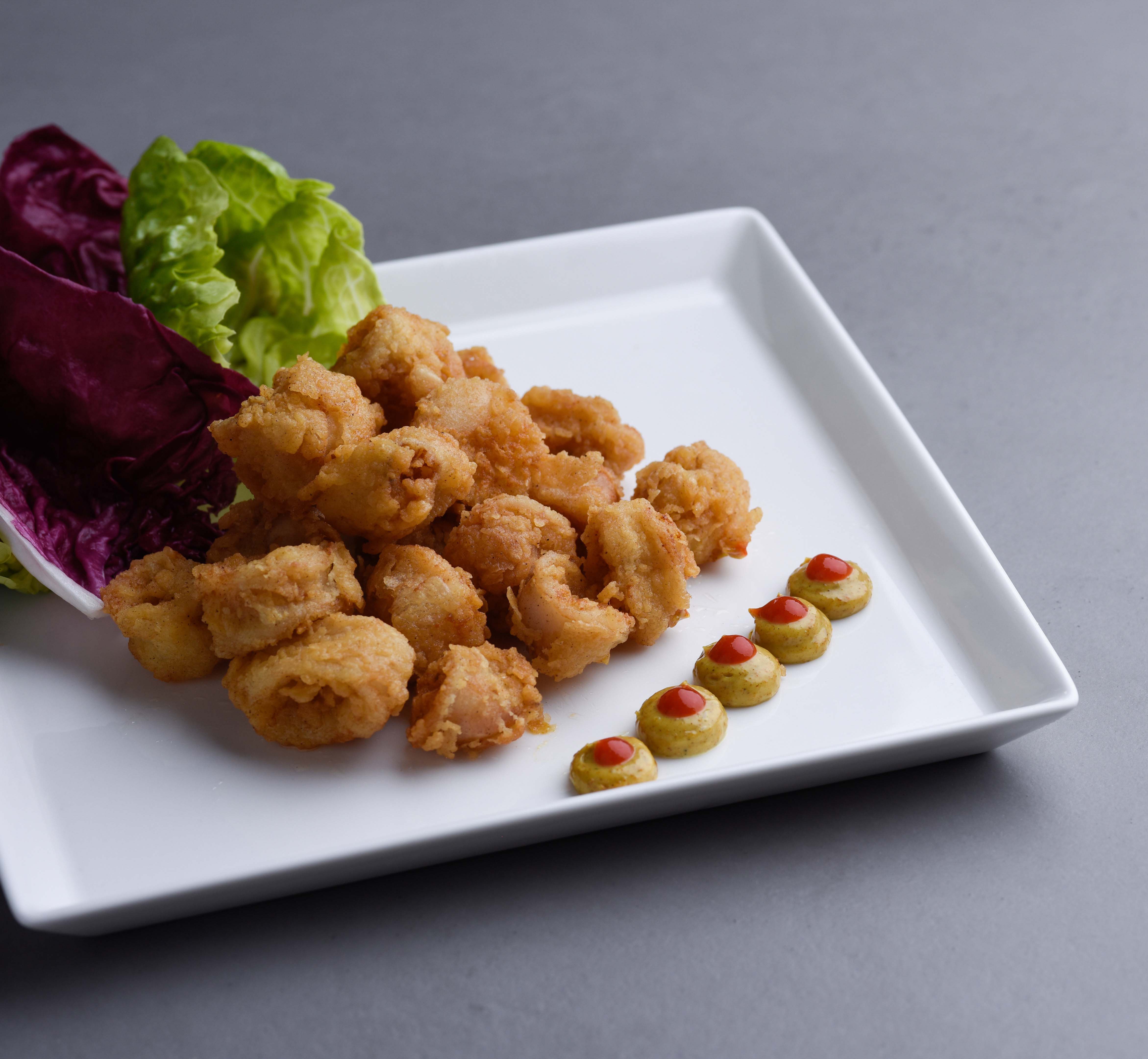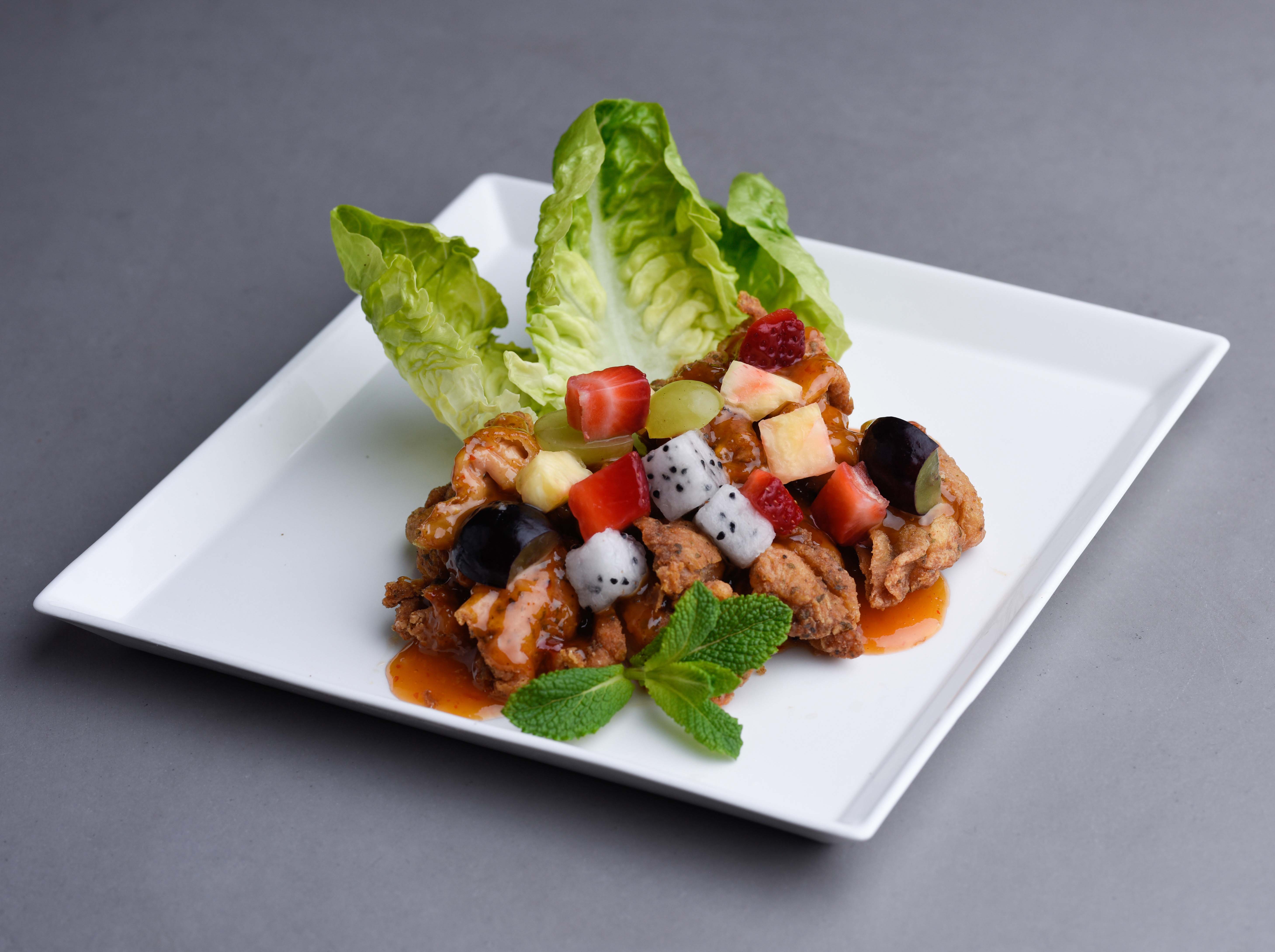 Deep fried crispy boneless chicken thighs served with fresh fruits and a creamy chilli sauce.
